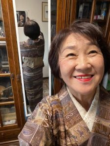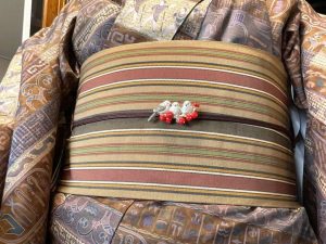 そんな気持ちで決めた着物は 茶系の染め大島エジプト模様 帯は茶系の半幅博多帯 茶色の帯締めに 帯留はこれ 多分 ナナカマドの実と シマエナガ