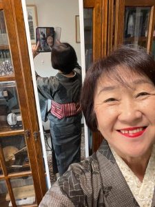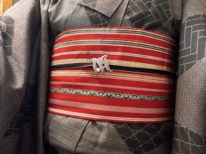 着物は黒の大島亀甲模様 お気に入りだ。 帯は赤い博多帯 気合いを入れないと ぐんにゃりしちゃうから 帯締めは黒 帯留はむつみのM