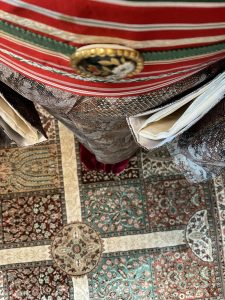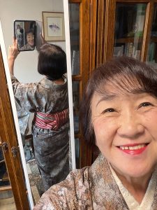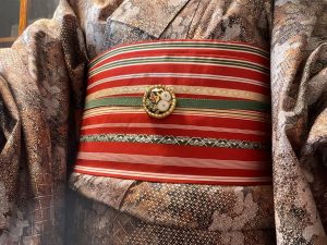 着物は染め大島 帯は赤の半幅博多帯 帯留は花 帯締めはモスグリーン