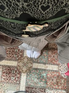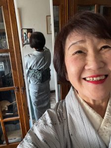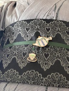 選んだ着物は モスグリーンが入った大島 半幅帯は黒にハート 帯締めもモスグリーン 帯留はグリーンが入った急須と茶碗 あ、お茶の滴りもモスグリーン 落ち着いた日になりそうだ。