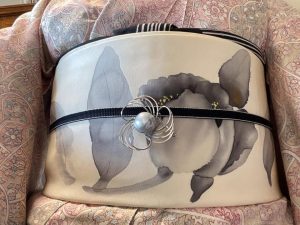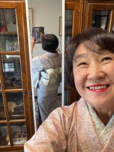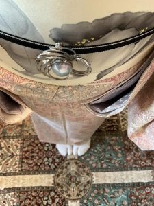 着物は ピンクの小紋 叔母の形見 帯は塩瀬の墨描き これも叔母の形見 帯締め帯揚げを黒にして 華やかなブローチを帯留に