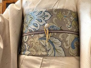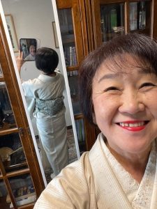 今日の着物はベージュの紬 白に近いベージュだ。 この帯はリバーシブルで 本当は裏の幾何学模様を 締めようと思ったのに 無意識に青い花柄の方を選んでいた。 柔らかさが欲しかったのかしら。