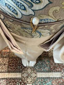 帯締めは焦茶 帯留は真珠のブローチ 母の形見だ。 なんとなく 春を思わせる感じになった。