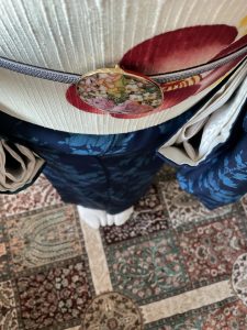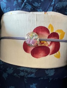 今日の着物は春 青の臈纈染 帯は梅 帯留はピンクの七宝焼き 花は薔薇?牡丹? 明日から通常感覚に戻らねばねー