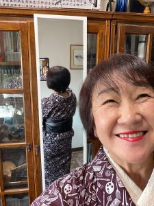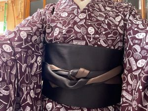 今日の着物は 髪結処模様 帯は着物ベルト 仰向けに寝ても大丈夫!