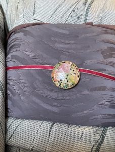帯は紫 祖母の形見だ。 帯締めは赤 帯留は華やかに