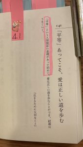 今日の言葉 【「平等」あってこそ、愛は正しい道を歩む】 平等を日常生活の中で普通に実践できるか? 平等が行動に結びついてこそ、 平等という人間関係の基礎があるのだと思う。 自分も配偶者も。