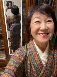 着物は小紋 紫の帯にピンクの帯締め 学ぶ仲間は40代 着物で若さアップ!