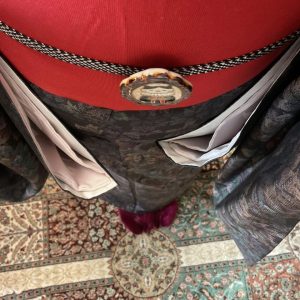着物は茶色のエジプト模様の大島