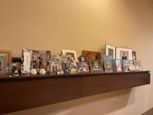 食卓テーブルの横に並ぶ家族の写真を見る。